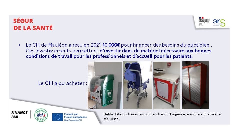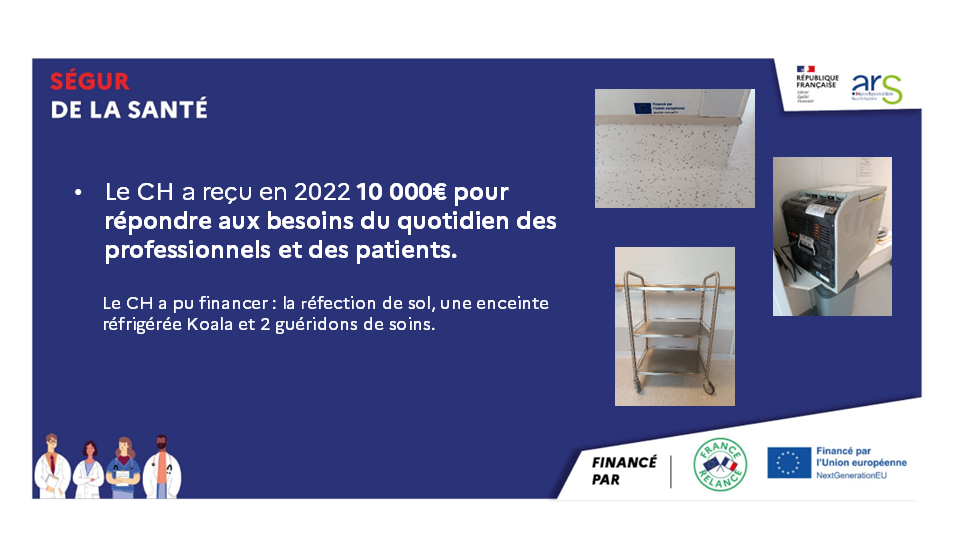 Une part de cet investissement consiste à soutenir les investissements courants – ou investissements du quotidien – des établissements de santé. Cette enveloppe est financée en partie par le Fonds européen de développement régional et est destinée à remettre à niveau les matériels et équipements, qu’ils soient hôteliers, logistiques, informatiques ou médicaux, et de permettre des travaux de rénovation légère, afin d’améliorer l’accueil et la qualité des soins des patients et la qualité de vie des professionnels.